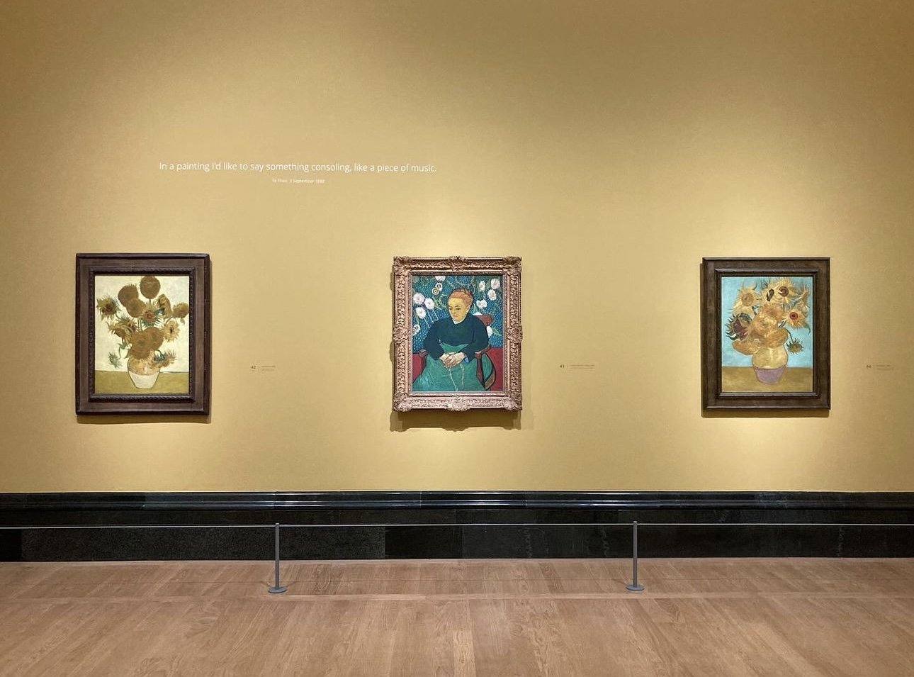 Van Gogh wrote in his letters that he’d like one sunflower painting with a yellow background and one with a blue background on each side of “The Lullaby” because he considered it the ultimate way his work could give comfort. This is the first time these paintings have been displayed in the way he truly wanted.